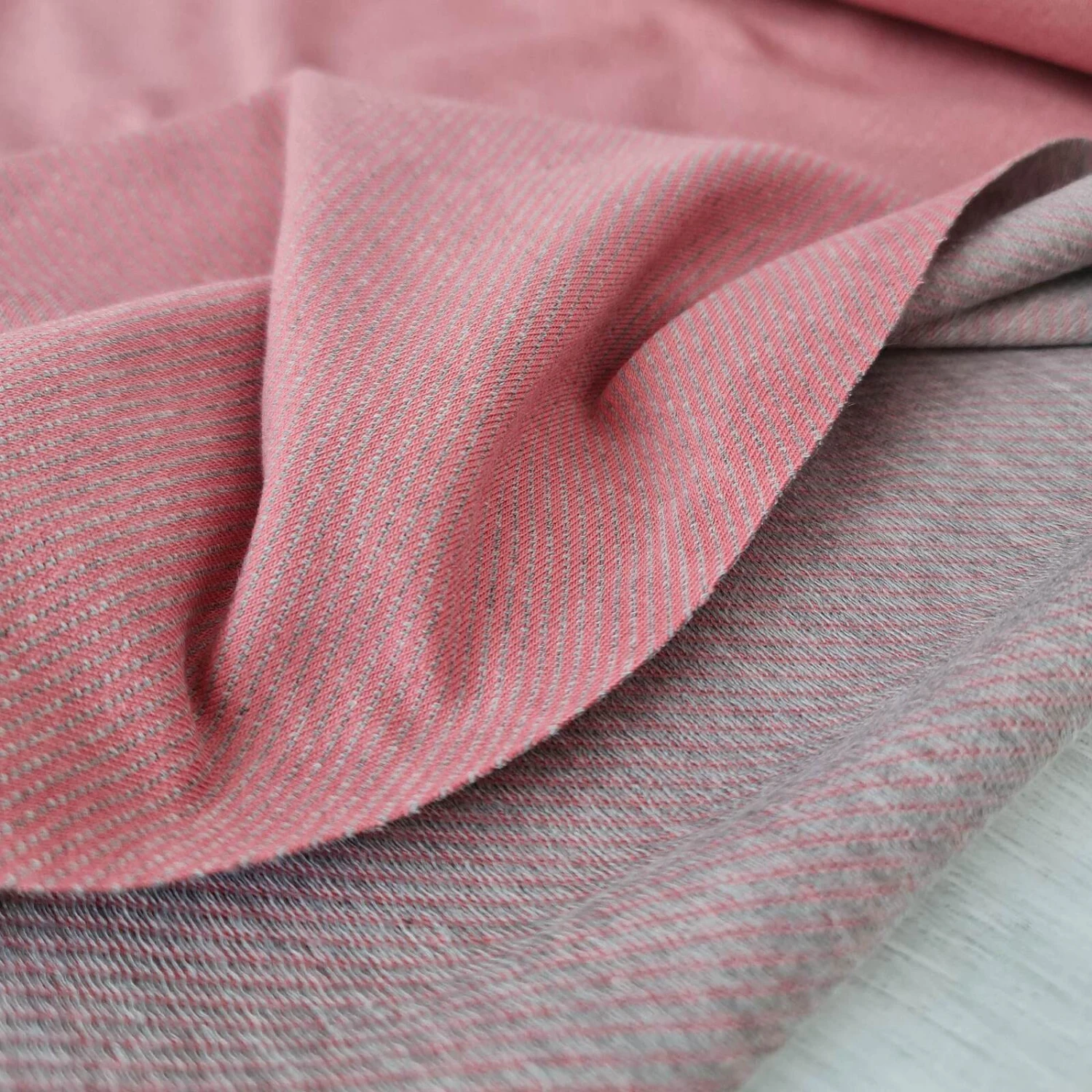 This particular fabric is a versatile stretch fabric with a unique diagonal striped pattern knitted into the design, suitable for a vast range of garment styles. ‘Jacquard’ fabric refers to any type of pattern that is woven (knitted) directly into the material (rather than printed or embroidered onto the fabric).